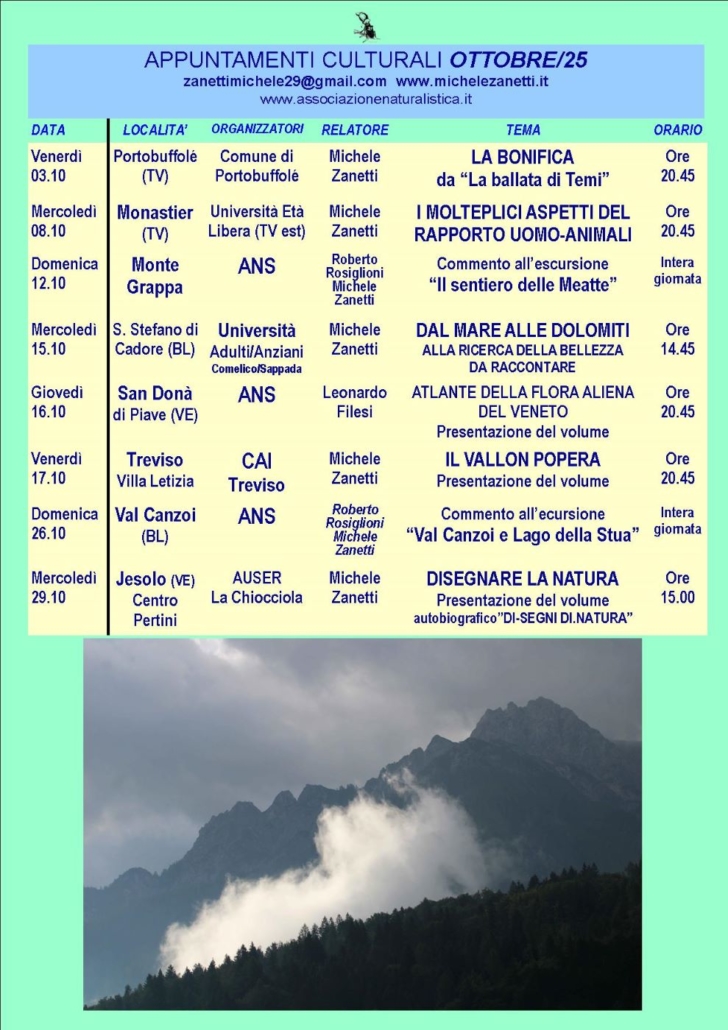 Svolgo da decenni una intensa attività divulgativa su temi di tipo naturalistico, ambientale ed ecologico, con particolare riferimento al Territorio veneto e agli ambiti di maggiore interesse del Territorio nazionale. Tale attività comprende, inoltre, la presentazione dei lavori di narrativa.