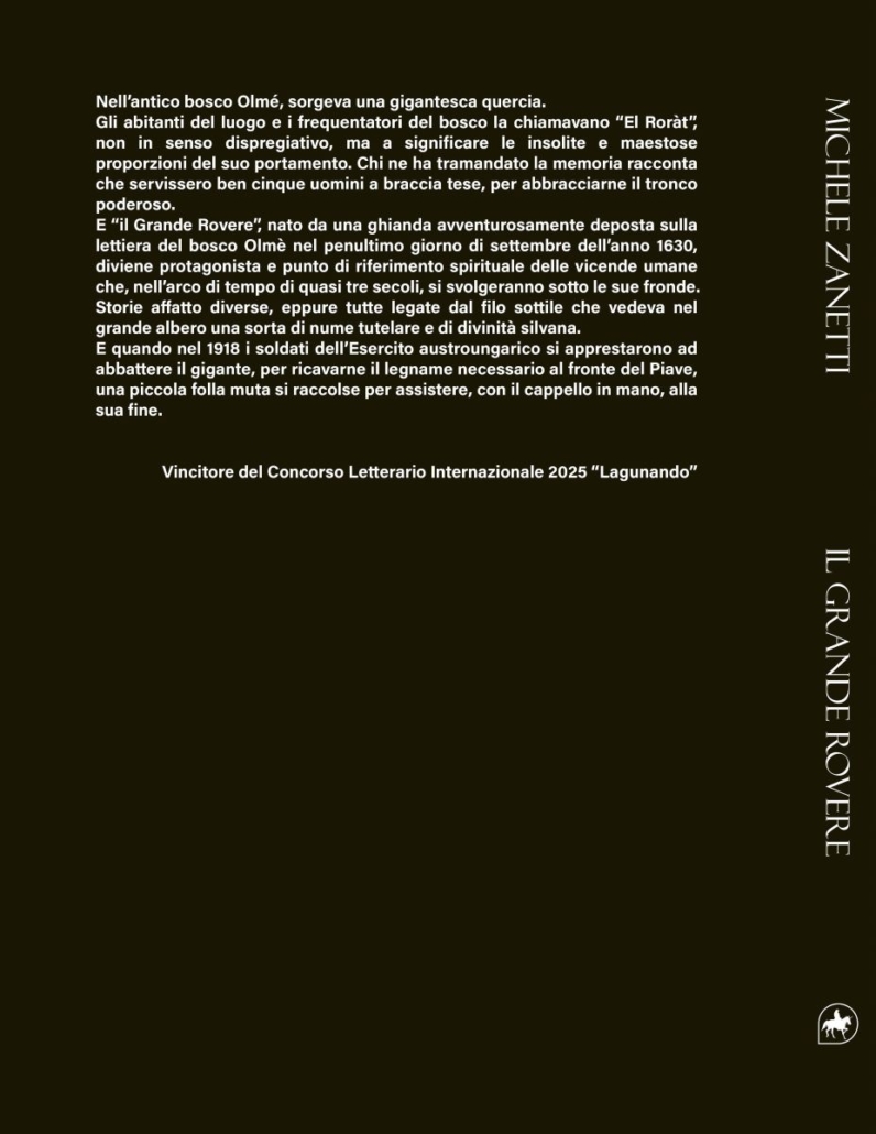 Storie affatto diverse, eppure tutte legate dal filo sottile che vedeva nel grande albero una sorta di nume tutelare e di divinità silvana. E quando nel 1918 i soldati dell’Esercito austroungarico si apprestarono ad abbattere il gigante, per ricavarne il legname necessario al fronte del Piave, una piccola folla muta si raccolse per assistere, con il cappello in mano, alla sua fine. Vincitore del IX Concorso Letterario Internazionale “Lagunando”.